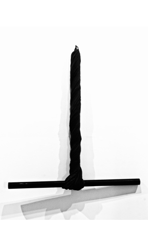 In Torsione per esempio gioca con la forza naturale presente anche nel titolo: un panno attorcigliato fino allo stremo è appoggiato ad una superficie in modo che la tensione non venga sciolta e di conseguenza l’opera d’arte continui ad esistere. Stessa precarietà, ma più effimera ancora è Scultura che mangia, in cui l’elemento naturale presente non può che completare il suo ciclo vitale e far crollare l’opera su sé stessa nel momento in cui esso smette di esistere. L’idea paradossale presente in questa scultura parte da un concetto reale e concreto, ovvero troviamo un’insalata che schiacciata in mezzo a due blocchi in pietra diventa vivo e fisico sostegno, ma che poi andando ad appassire si allontana dal concetto stesso di realtà. Il concettualismo che spunta nonostante la fisicità evidente e possente degli elementi, diventa chiaro messaggio della vita e della natura stessa. La scultura non deve essere qualcosa di osservato nel momento, non deve essere compresa solo con uno sguardo, sennò non ci sarebbe nessun pensiero oltre due semplici massi e un ceppo di insalata. Indagare l’opera significa immaginarla nel tempo e imparare dalla sua precarietà. Sappiamo che la sua esistenza non potrà che esserci per pochi giorni, difatti il cedere continuo della natura, il memento mori dell’appassimento fa andare oltre l’immortale momento della posa. Il nostro sguardo deve andare oltre ciò che vede, deve riconoscere la decadenza, l’impossibilità dell’eterna stasi e dell’infinito silenzio, deve sentire la tensione continua del momento. Dobbiamo vedere lo scorrere inesorabile del tempo, soffermarci a capire che non si può comprendere tutto ad un primo sguardo.